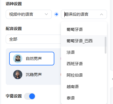 ②AI自动配音:在翻译时,可以选择语音进行翻译,然后你可以选择各种各样的音色,这样在翻译后,语音也同样转译成了目标语言;