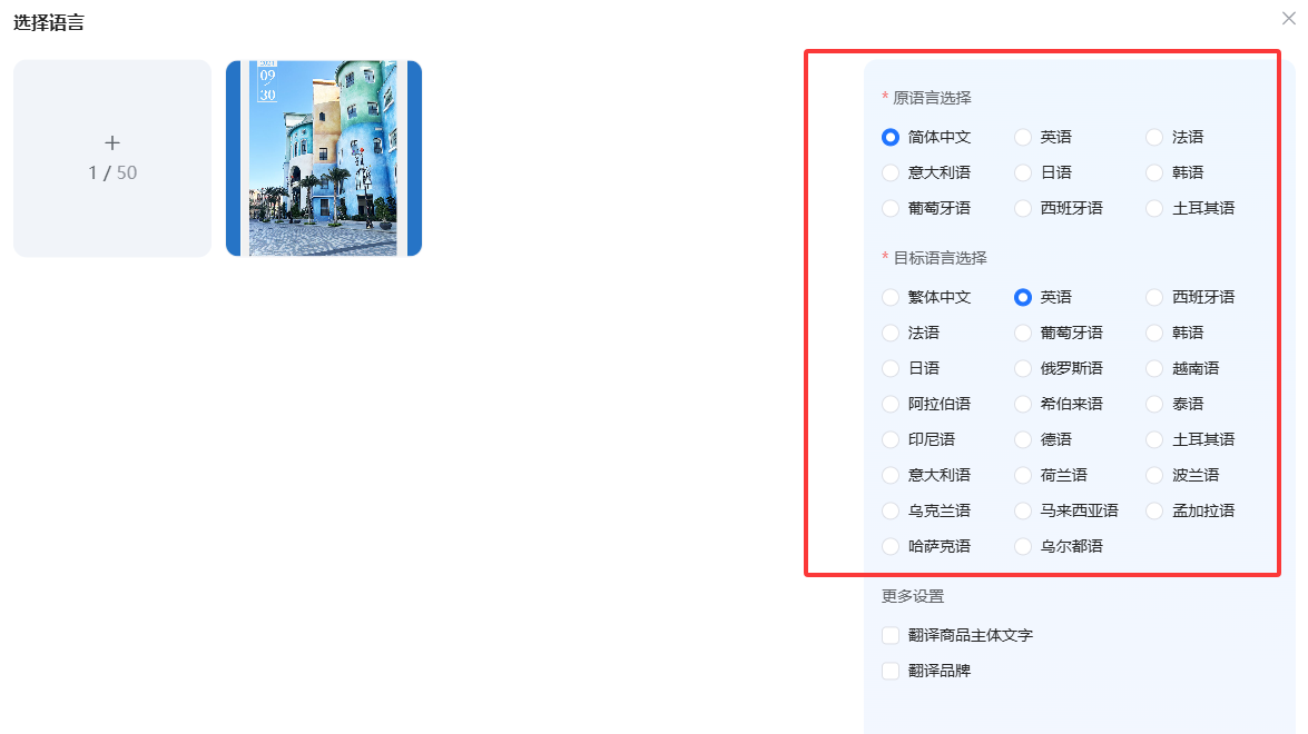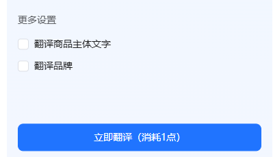 此外,在“更多设置”中,我们可以针对不同的情况去做出一些个性化的需求设置,比如可以选择是否“翻译商品主体文字”或者“翻译品牌文字”,如果您不想让 AI 翻译掉自己家的品牌 Logo 或者产品的型号信息的话,只需要把这两个复选框都给去掉就行了,十分方便且智能化!