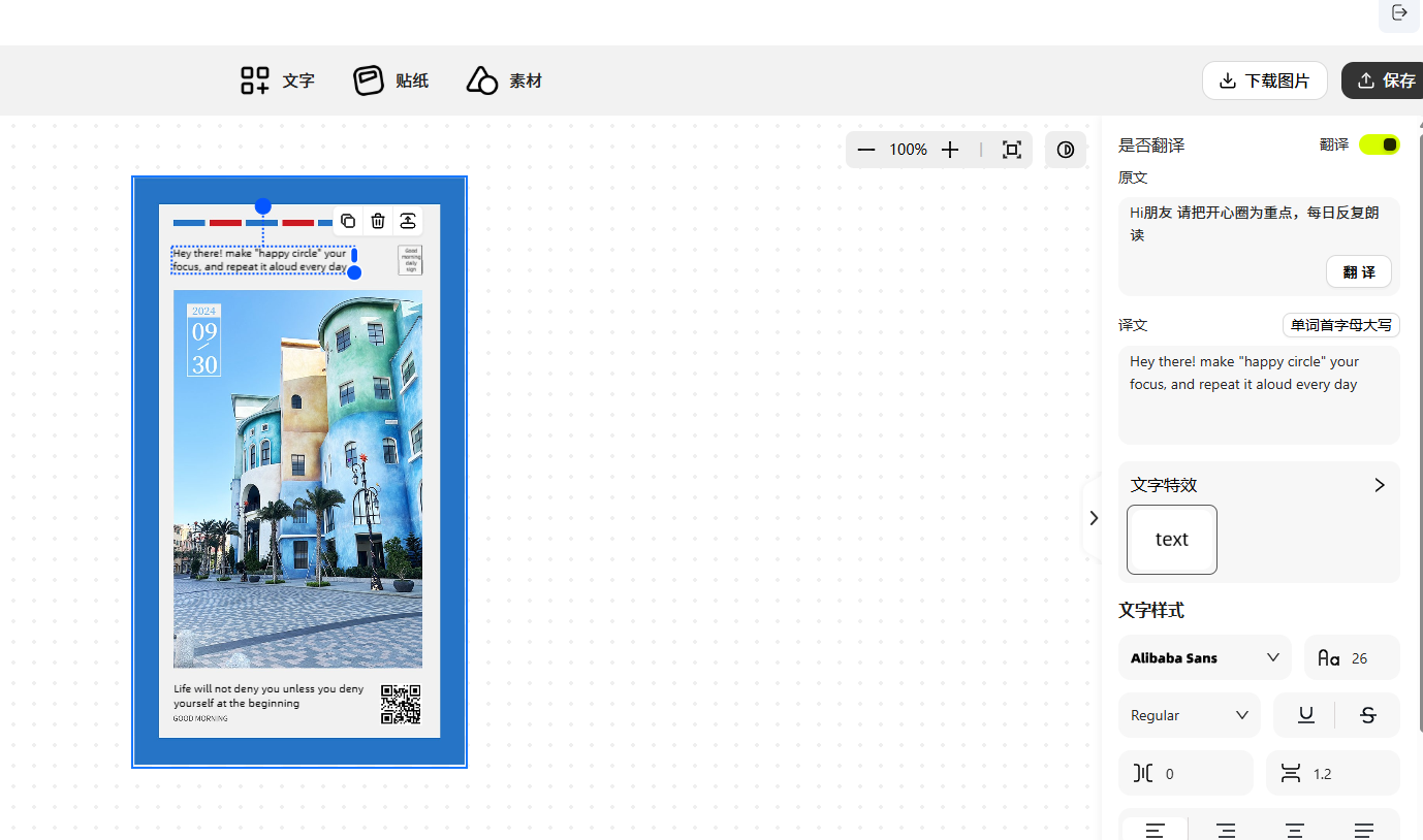 最后,我们点击下面那个“手动调整”按钮,可以打开一个在线编辑器窗口来进行更精细的二次加工,我们可以对文字进行移动、修改字号大小或者是更改字体类型等一系列操作,并且这个编辑器还自带了一个比较丰富的贴纸素材库供我们调取使用,所以在美化的时候我们也可以借助它们来提升整张图片的设计水准,最后确认好了所有的细节内容之后再点击下载就可以了。