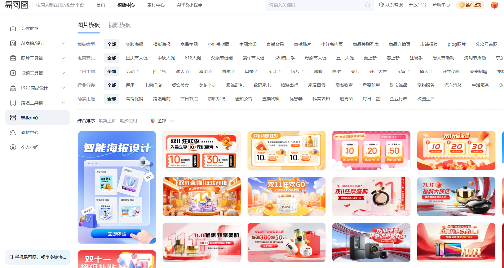 海量模版:平台上拥有大量通用的电商/社媒模版可供使用,覆盖各大节日活动,每日更新100+,并且这些模板均可商用。