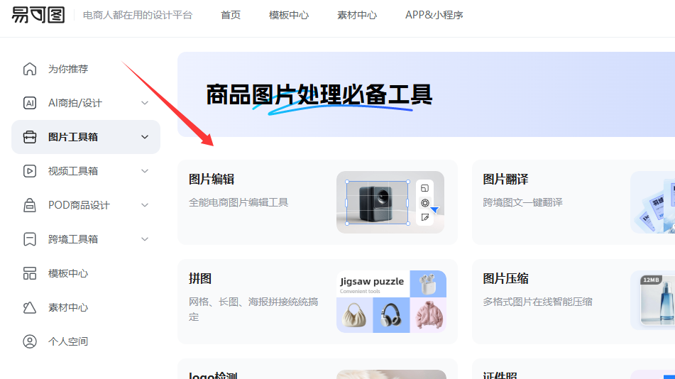首先,进入易可图的在线图片编辑器。然后,点击上传按钮,将您需要校正的那张倾斜的图片加载到编辑界面中。
