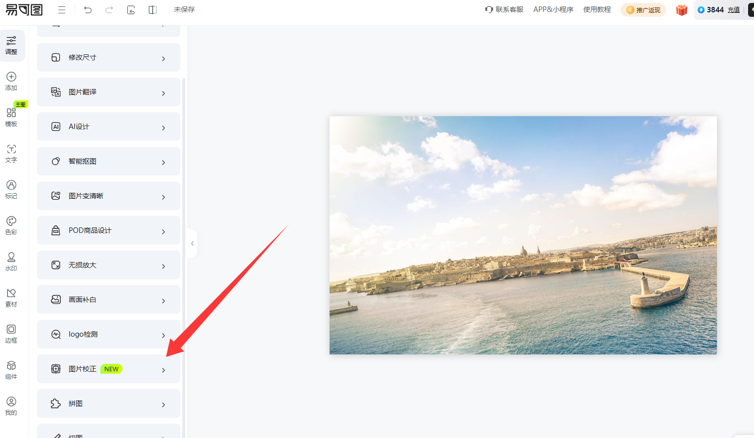 图片上传成功后,在界面右侧的工具栏或调整选项中,浏览并找到“图片校正”功能,点击进入专门的校正操作界面。
