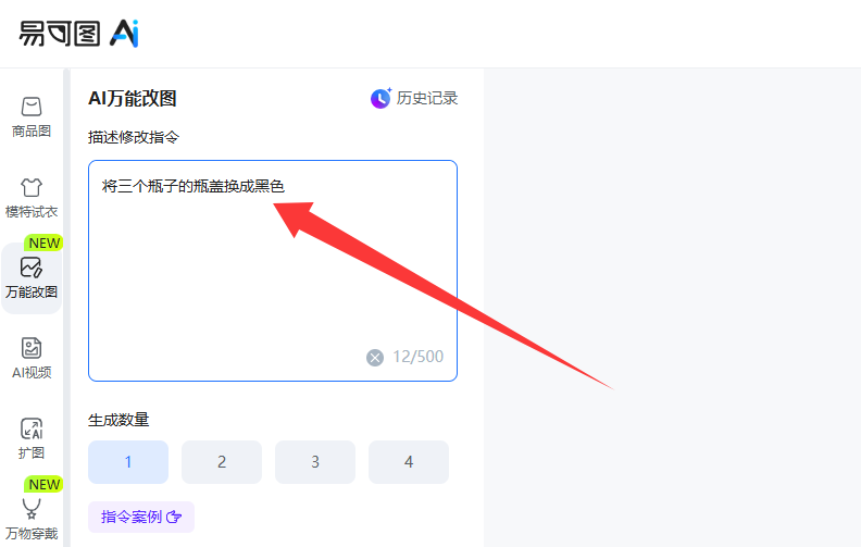 2、在左边的指令描述框中写下你需要改变的部分,比如“把三个瓶子得瓶盖换成黑色”;