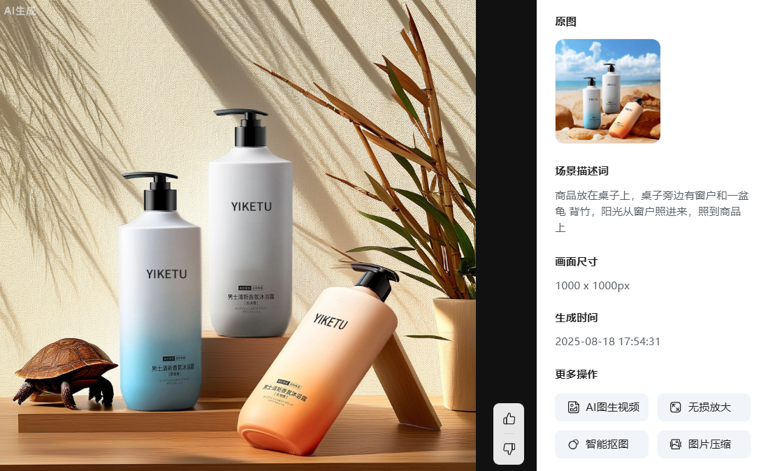 AI智能光影与透视完美结合:当你选定了某个场景之后,AI就开始了自己的工作啦,它会根据你的产品本身的光照朝向、材质属性、甚至外形结构来进行非常细致的建模,并最终呈现出真实的投影、倒影以及环境光反射的效果。你的产品不再是仅仅被粘贴到了某张场景图上面那么简单而已,而是在场景里真正的摆设了一样,所有灯光效果都非常的接近现实世界的真实情况!