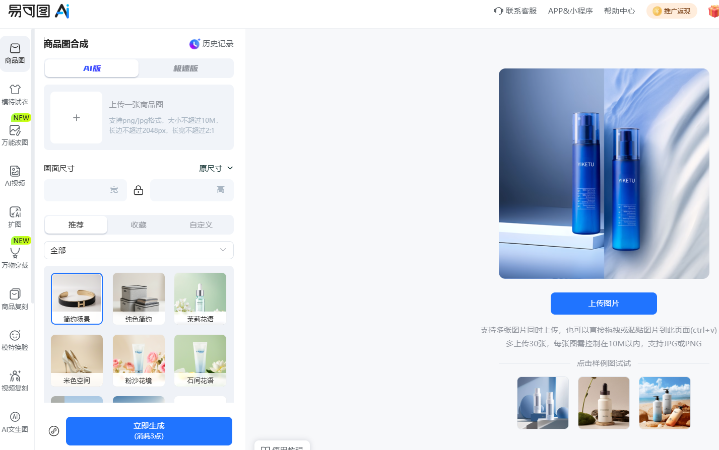 易可图作为一款电商AI设计平台,它的AI商品图功能非常强,可以为你的产品打造商业级的场景。让您所有的商家都可以像拥有一家专业的摄影棚一样,获得那些顶级的商品照。具体特点如下: