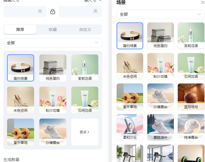 海量且多样的场景库:你只需要上传一张背景干净的产品图即可,便可以在易可图庞大的场景库里进行任意的选择。其中包含了大量各种不同主题类型的场景,比如极简主义的纯色系的场景、具有高级感的影棚风的几何构型、日常生活的家居类场景(包括厨房台面、浴室大理石、卧室床头等)、大自然中的室外场景(包含海滩、树林、草坪等等)、以及迎合节日气氛的各类营销场景(如圣诞节、元旦节等等)