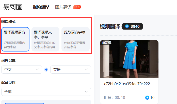 三种翻译方式可供选择:① 翻译视频的语音部分(AI智能识别人物对话,并翻译出 AI配音);② 翻译视频的文字字幕部分(只把视频画面里的文字/硬字幕翻译出来即可);③ 只翻译视频的语音部分,输出语音文件(适合后期想自己添加字幕的情况);