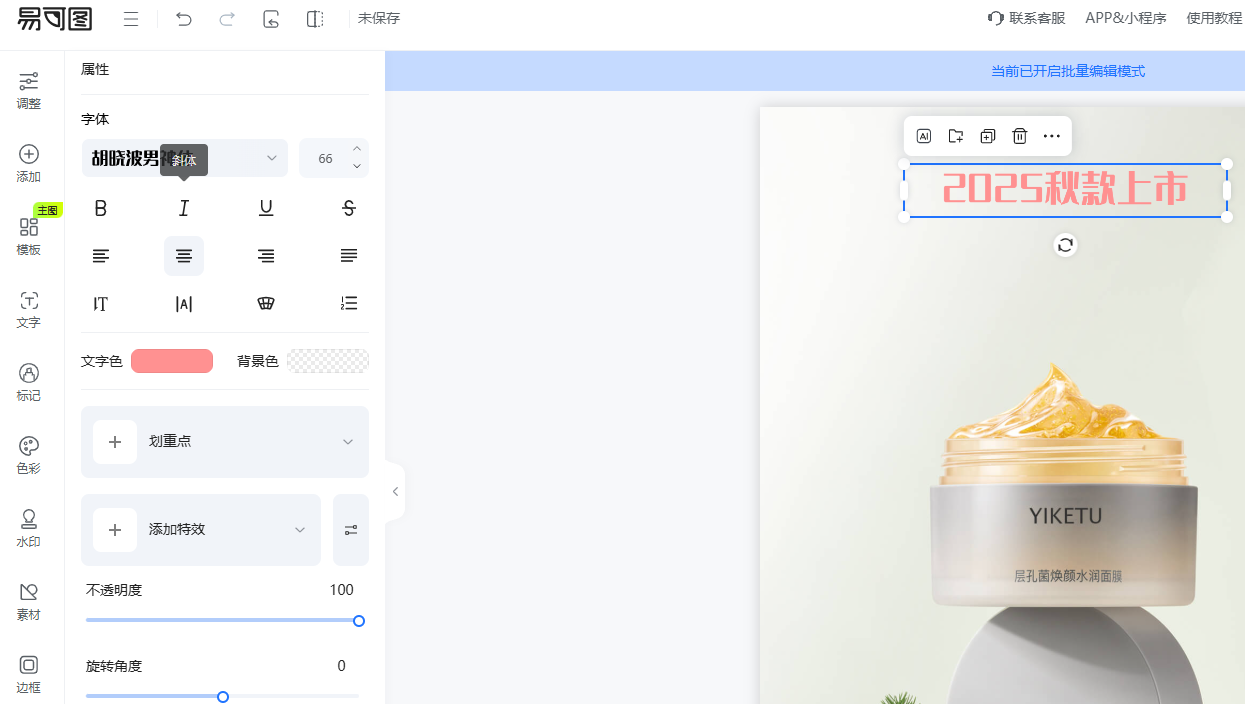 当图片上传完毕后,选择文本框添加进图片,然后在文本框里填入你要给每张照片添加的内容即可比如品牌名或者是广告标语 2025秋款上市等等。下面就可以根据自己的需求去设置一下这些文字的格式了: