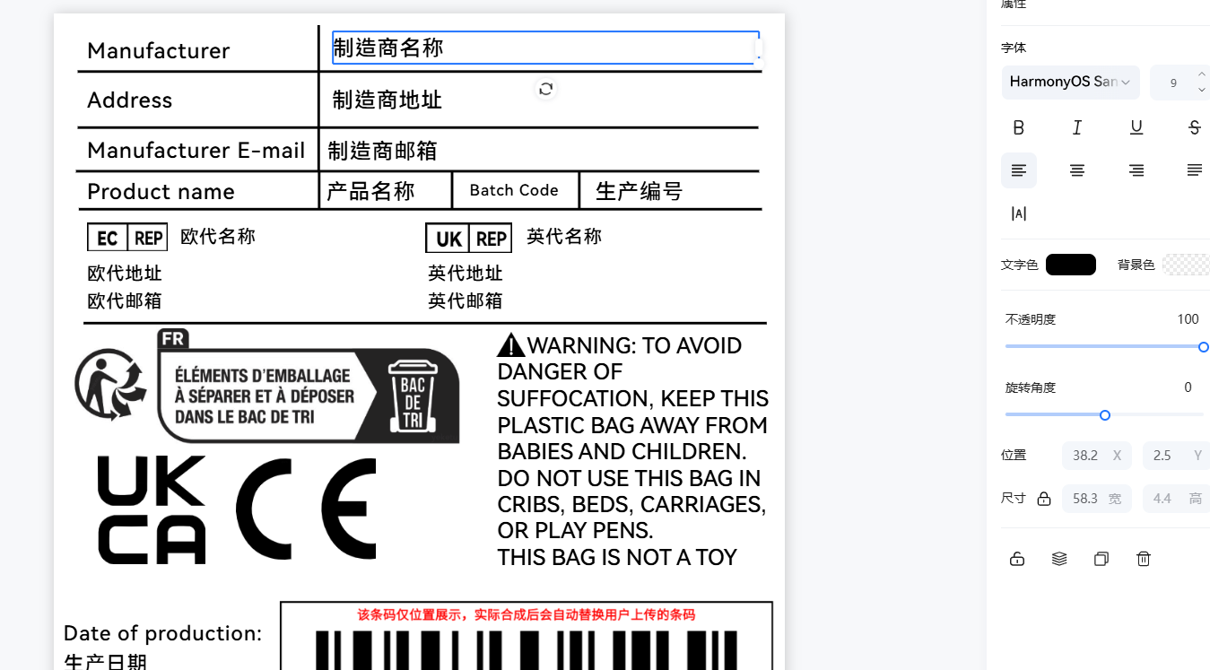 3、填写与配置信息:进入编辑区后,在 SKU/产地/成分等内容上进行录入或者修改操作,然后使用内嵌的工具添加一些必填项(CE 图标,警示语等),并且可以根据自己的喜好调节大小和位置。