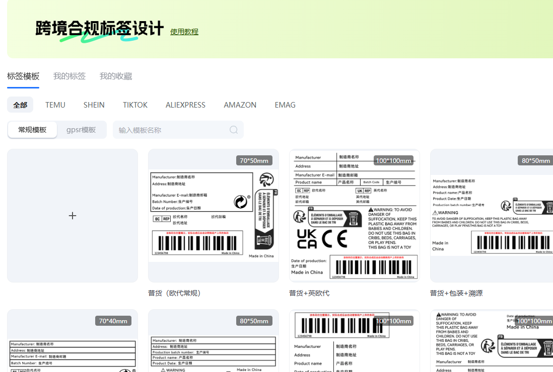 2、挑选模板:在跨境合规标签模块,依据商品所属类别(比如玩具类,纺织品),找到相应的标准模版;