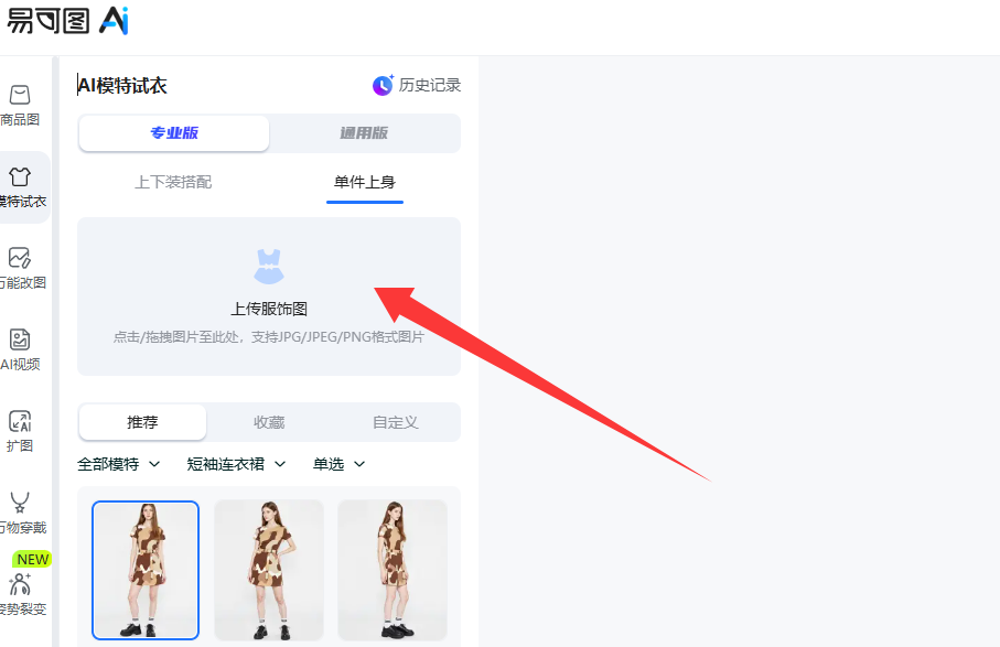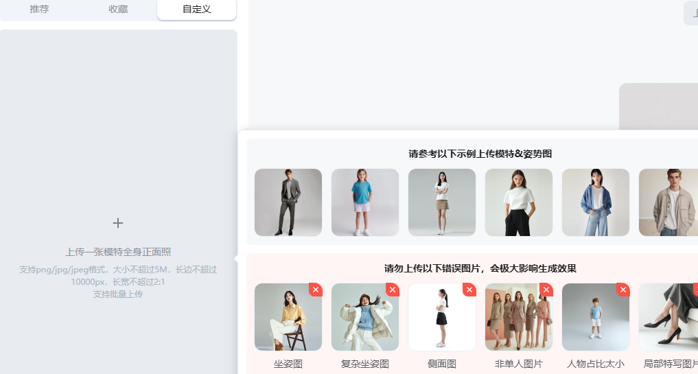 在AI模特试衣功能页面,先把你要替换掉的衣服图片传上来,再在模特中选择【自定义】选项,把你的照片上传。