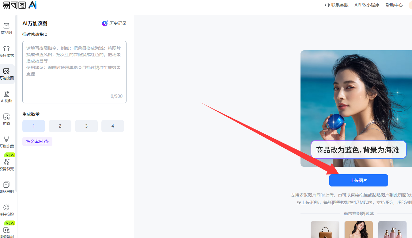 想要照片一键换装可以使用易可图平台,易可图有两个功能可以帮助我们解决这个问题,具体方法如下: