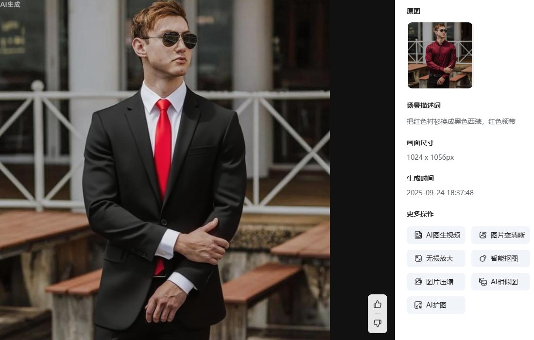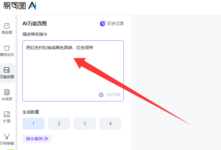 在左侧指令区中写出你需要改成什么样式的文字描述就行。比如说: “将照片中人物的上衣换成一件复古风格的白色衬衫”。或者:“将照片中的黑色连衣裙换成一件红色丝绒材质的晚礼服”。又或者是:“将人物身上的服装换成一套商务休闲西装并且提升图片整体的明亮度”,等等。只要是你想到的任何一种换装需求都可以在这里表达出来哦。