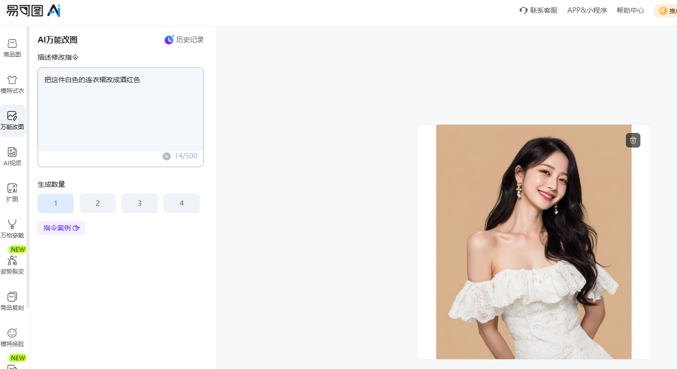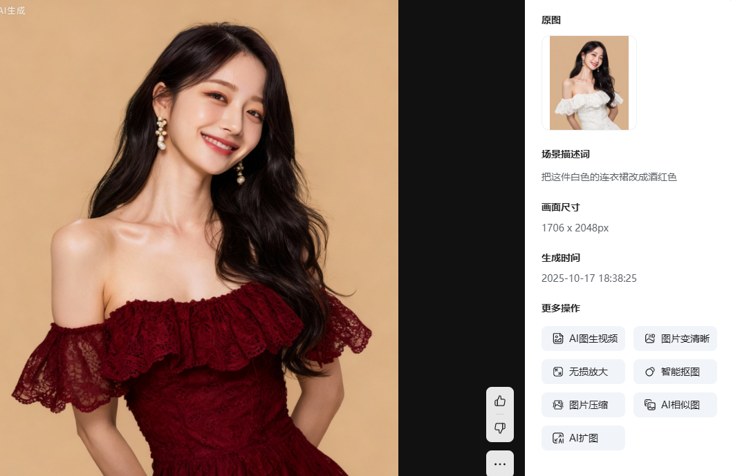 步骤二:输入修改图片指令。在指令框输入文字指令,描述你要达成的目标,下面是一些常用的指令:直接换色比如“把这件白色的连衣裙改成酒红色”。局部换色比如“将图片里沙发的坐垫部分换成米白色”。更换材质感比如“把这个塑料外壳的耳机,改成磨砂黑的质感”。指令越具体,AI的效果越好哦!
