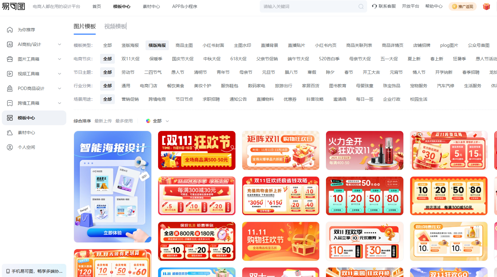 1、进入模板中心:首先打开易可图网站首页,点击上方导航栏中的模板中心,在模板中心选择横板海报或竖版海报。
