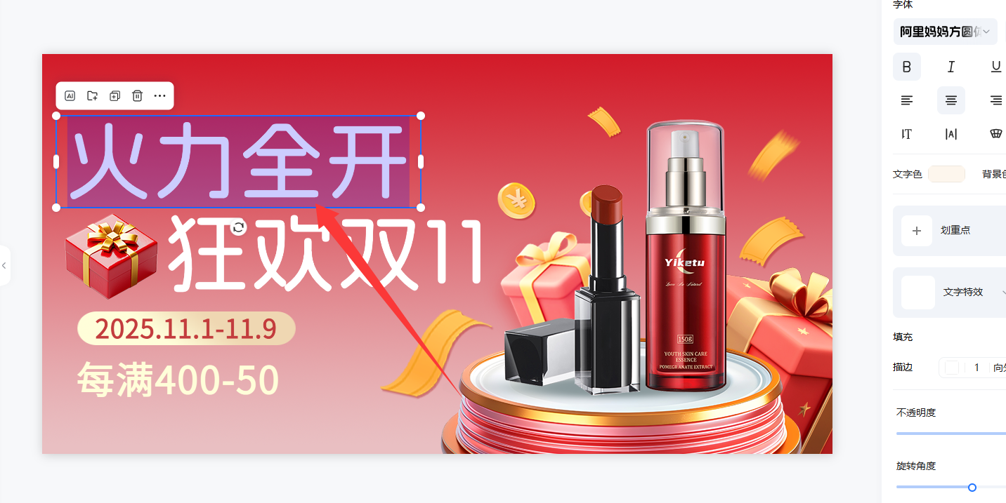 4、修改文案:模板上的所有文字都是可以编辑的,直接双击文本框,输入您的营销文案即可。