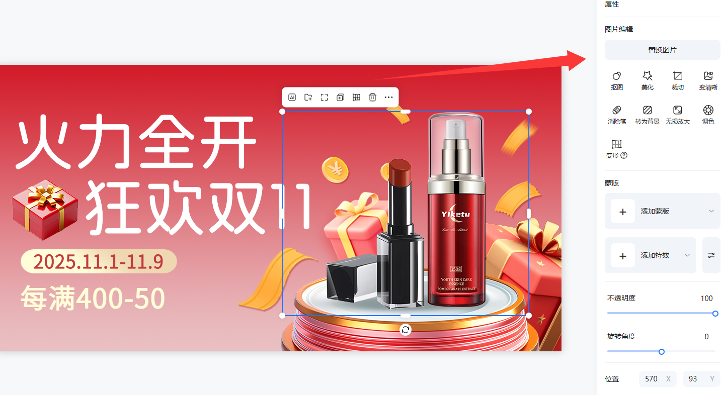 3、替换商品图:进入海报编辑器后,点击模板中的商品占位图,上传您自己的产品图,上传后,为了让你的产品完美融入海报背景,可以点击图片使用智能抠图功能,将产品图处理成透明底图,这样效果会更好。