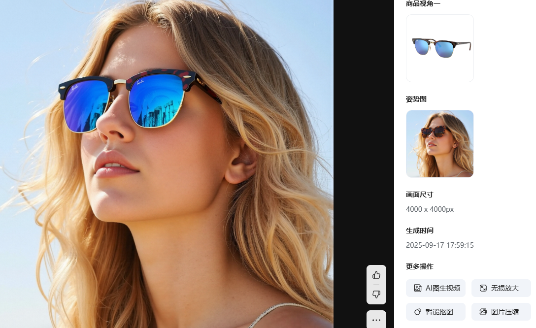 AI模特试衣(服装品类):这是针对服装卖家的功能。你只需上传一张服装的平铺图,就可以在平台提供的海量、多样化的AI模特库中,选择不同肤色、国籍、风格和场景的模特,AI便能一键将这件衣服穿在模特身上,效果非常逼真,褶皱和光影都处理得非常自然。