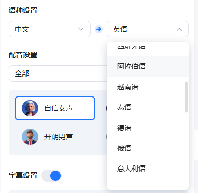 ②AI自动配音:在翻译时,可以选择语音进行翻译,然后你可以选择各种各样的音色,这样在翻译后,语音也同样转译成了目标语言;