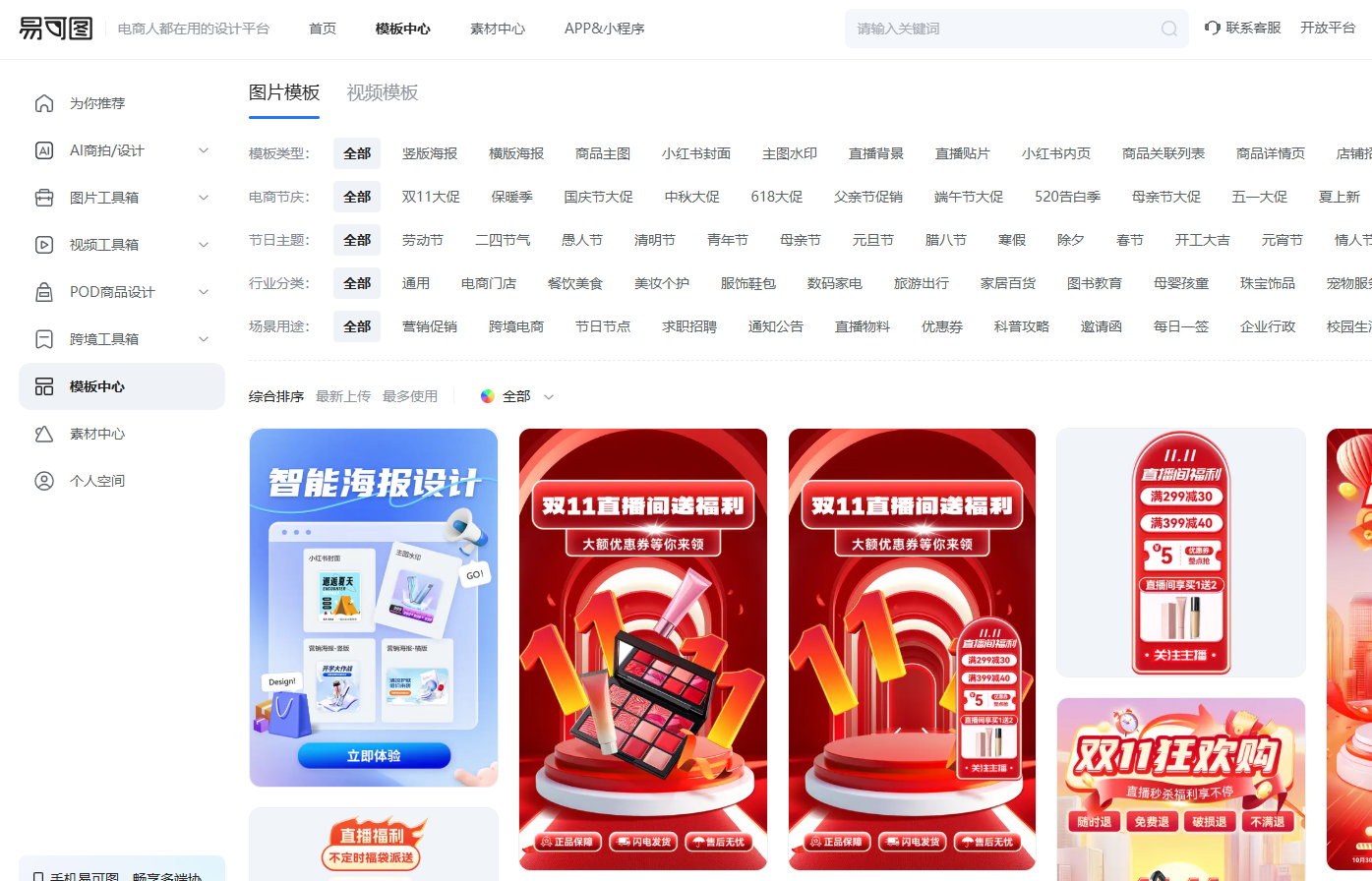 海量模版:平台上拥有大量通用的电商/社媒模版可供使用,覆盖各大节日活动,每日更新100+,并且这些模板均可商用。
