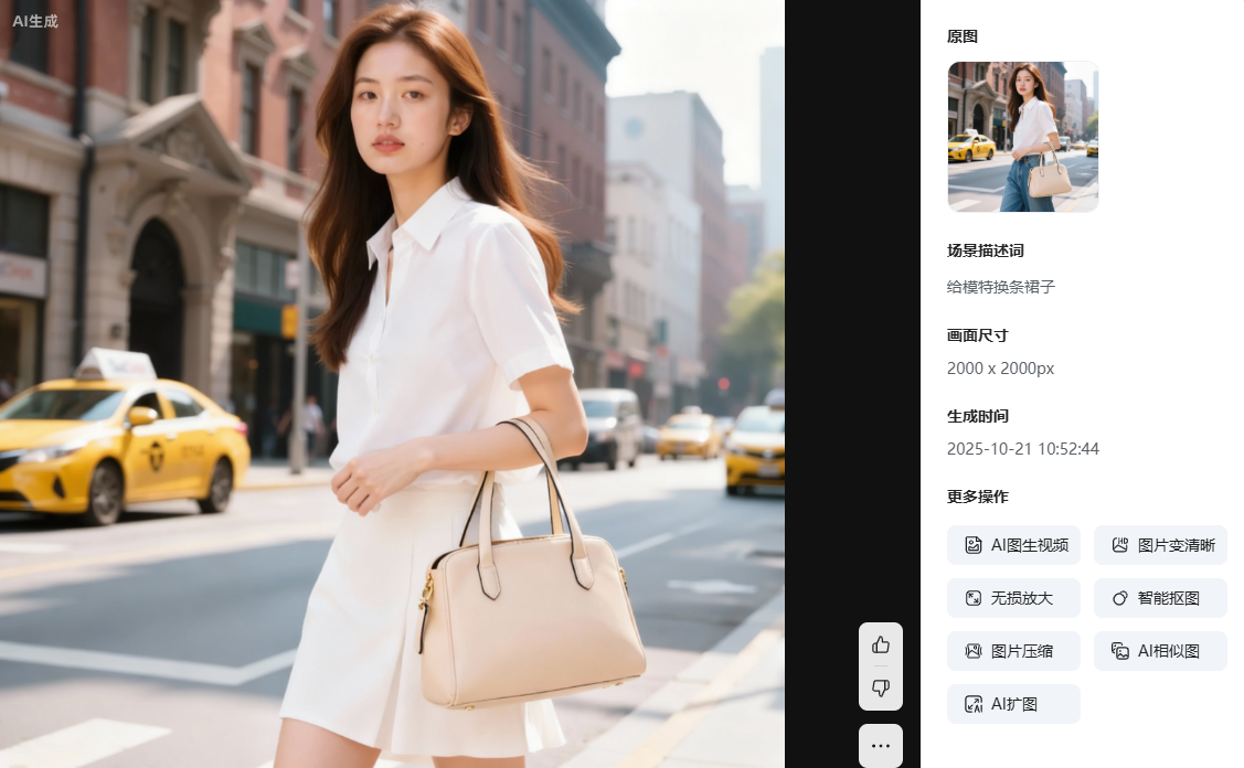 AI 智能修图:易可图提供「AI万能改图」这一强大功能,只需输入一些简单的语句描述就可以一键完成对图像的修改操作(比如:把背景换成蓝色天空、给模特穿条裙子吧、把这个字改成这个颜色),甚至可以把原图中的元素替换掉。