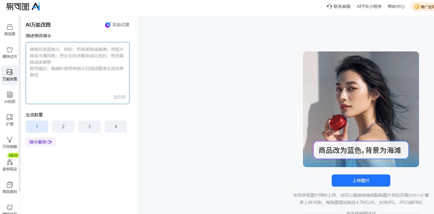 使用易可图的AI万能改图功能,不需要学习各种复杂修图工具,只需要简单的文字描述一下想要的效果即可得到对应的输出结果。