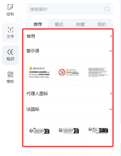 2、还集成各种商品标识警示语:易可图清楚地知道跨境行业对于合规性要求之严格,因此易可图内嵌了大量的满足多个国家或者多个平台要求的商品标识警示语,包括易碎品警示语、向上放置警示语、防火标志、包装安全警示语等等的图标或者文本模版供客户使用,只要点击一下就能把他们放到标签上,让商品能够顺利通关并且过审;