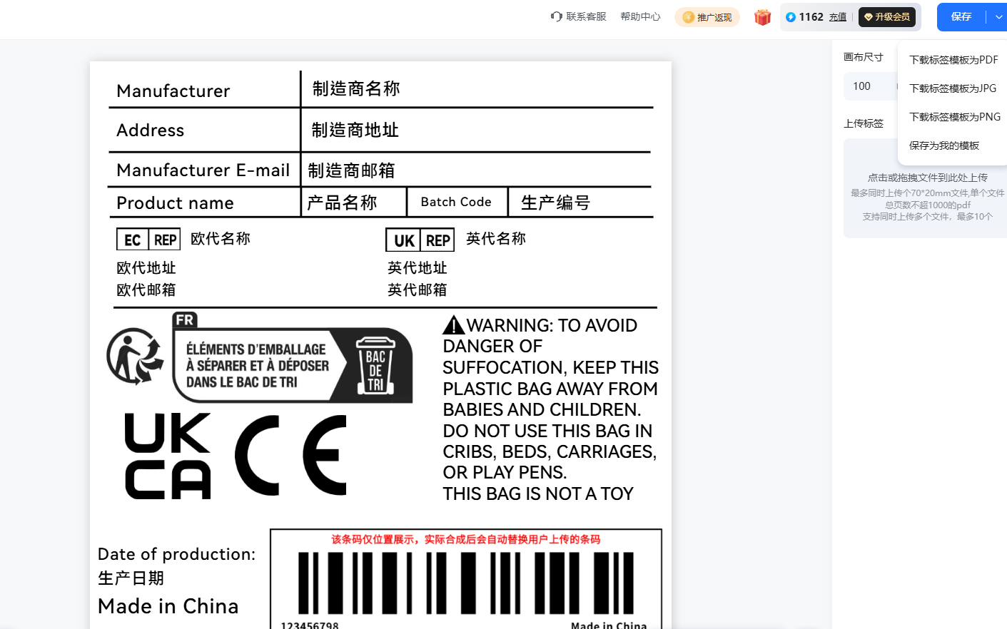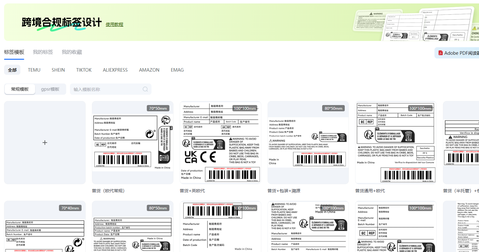 易可图是一个将图片设计工具+AI工具+电商素材生成融合在一起的一个综合型在线网站,为了解决卖家们在制作标签时对于效率和合规性的需求,易可图提供了跨境合规标签功能,具体如下: